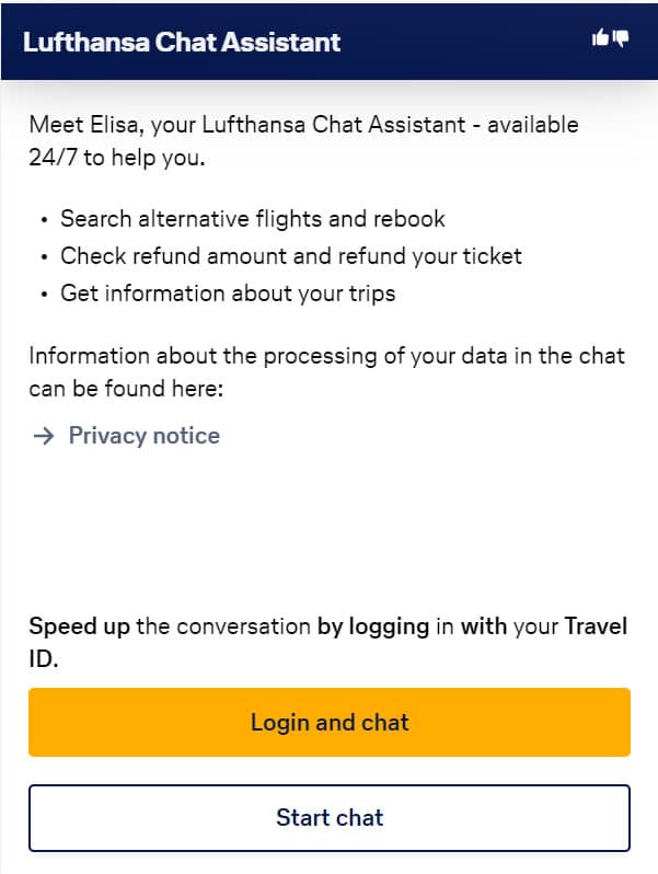 Tra le diverse soluzioni per entrare in contatto con il servizio di assistenza clienti di questa compagnia aerea, puoi scegliere di avviare una conversazione in chat con Elisa, l’assistente virtuale di Lufthansa.